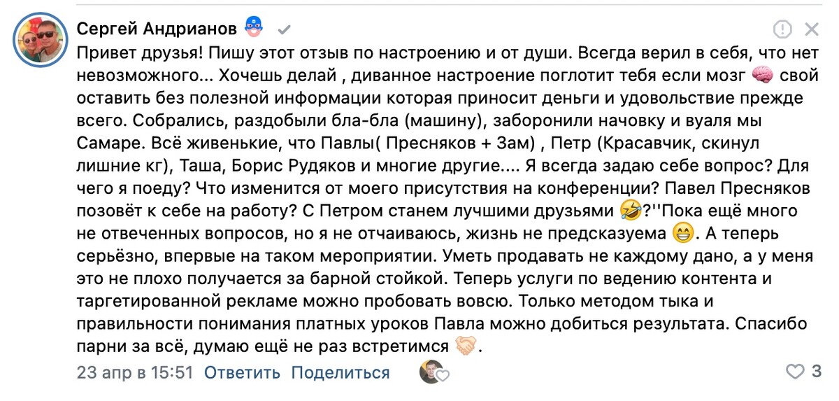 Я прекрасно знаю, как большая часть людей ходит на семинары. Вы слушаете информацию, заряжаетесь энергие и после этого возвращаетесь домой в свой привычный образ жизни. В идеале, надо что-то сделать из того, что вы узнали, но огня уже в глазах нет.